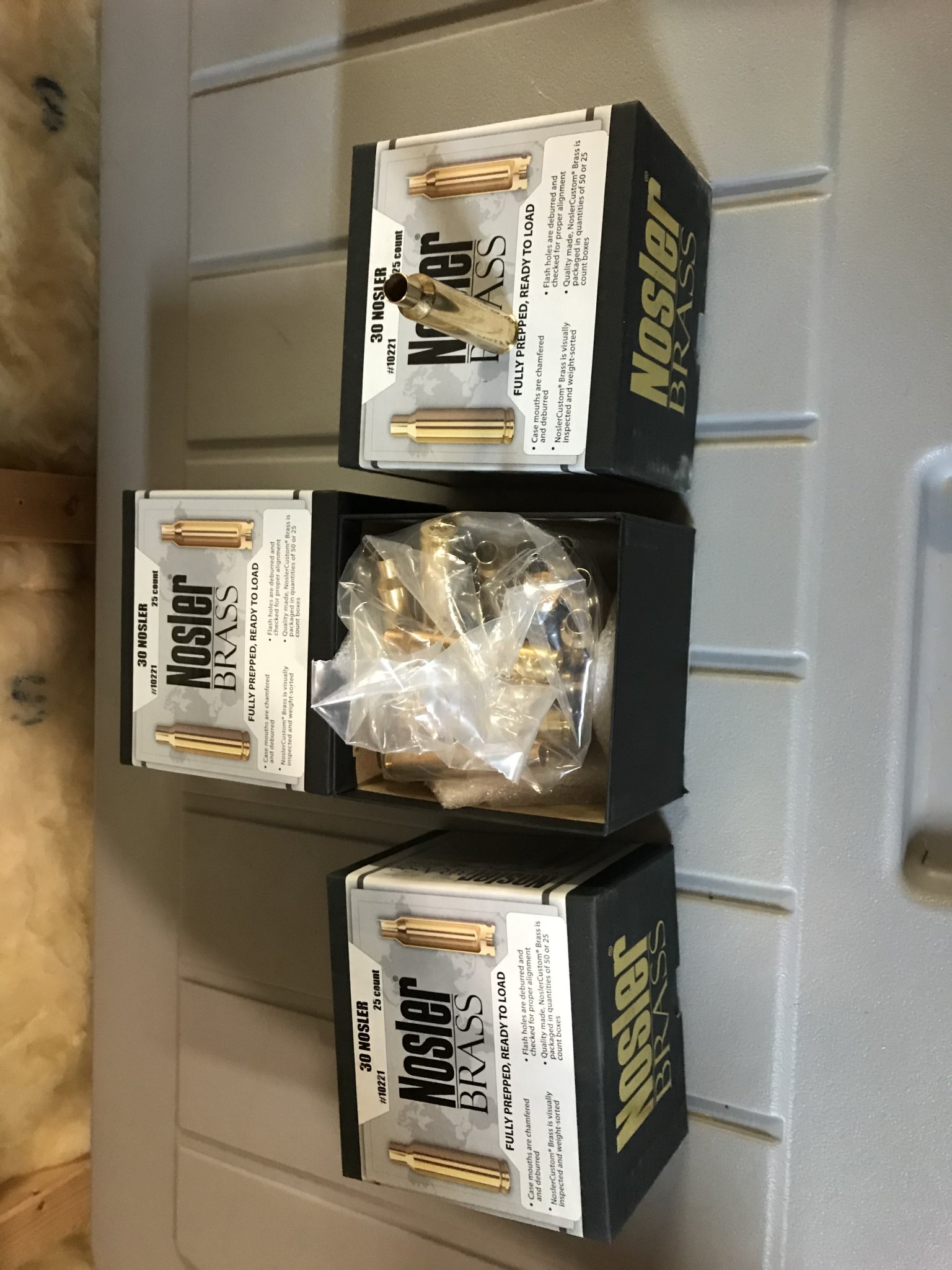 Have 3 boxes of Nosler brand 30 nosler brass. 2 unopened and one opened with one round missing. (25 rounds per box.) 74 rounds total. $55/box shipped.