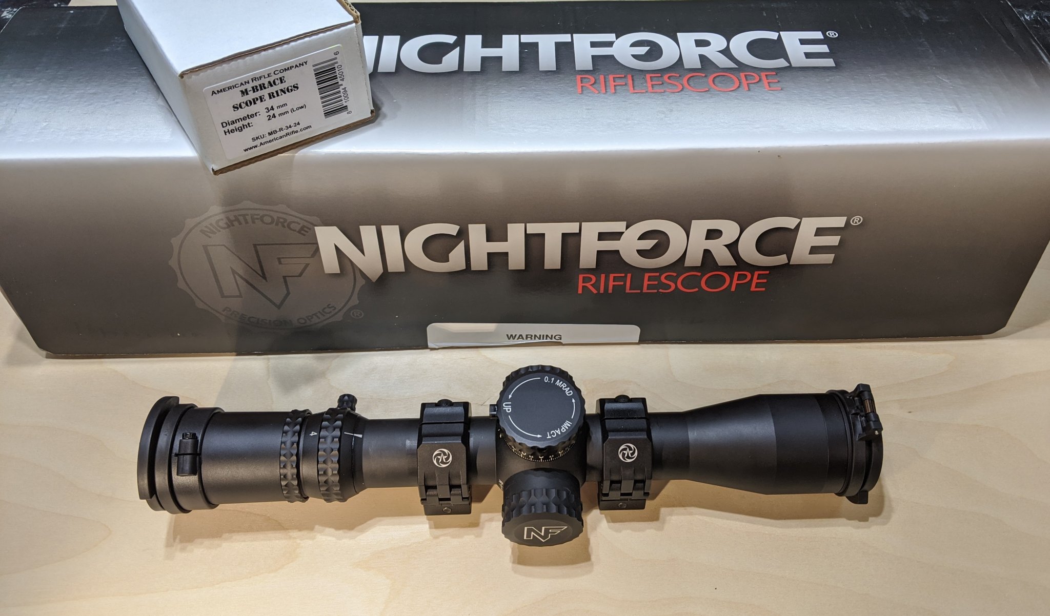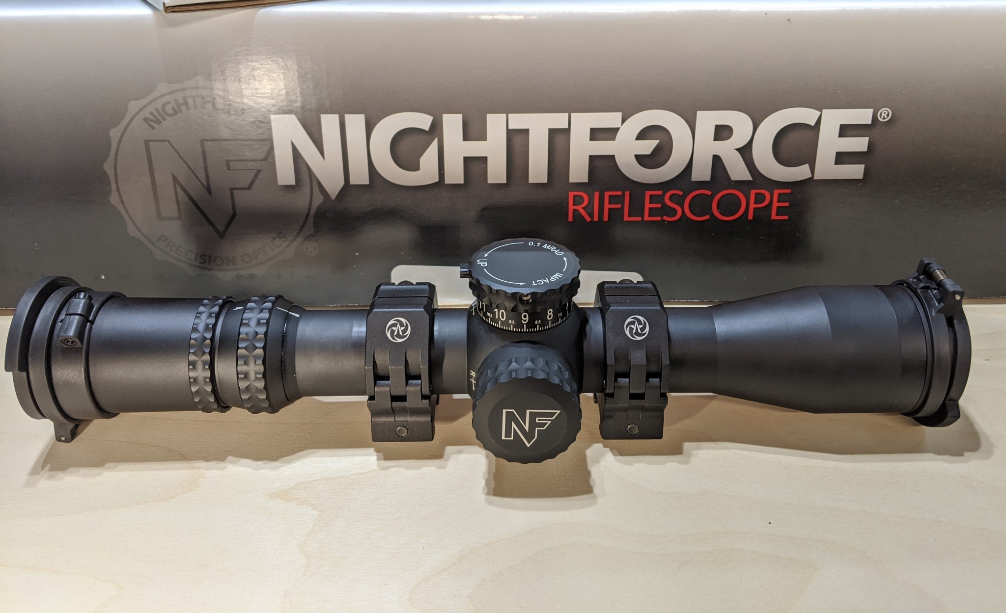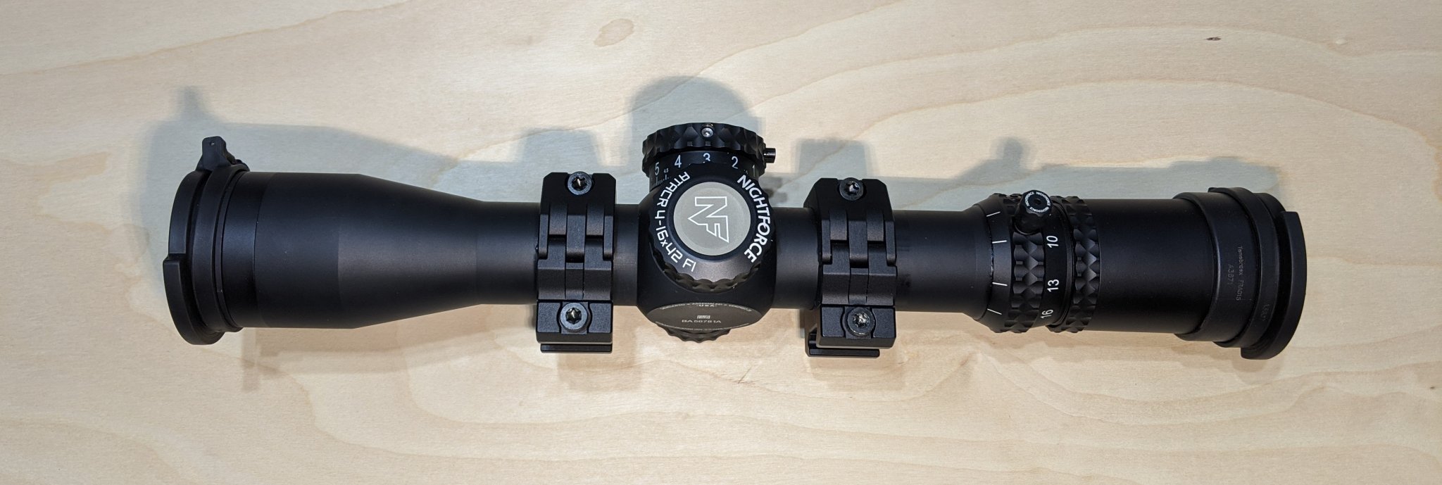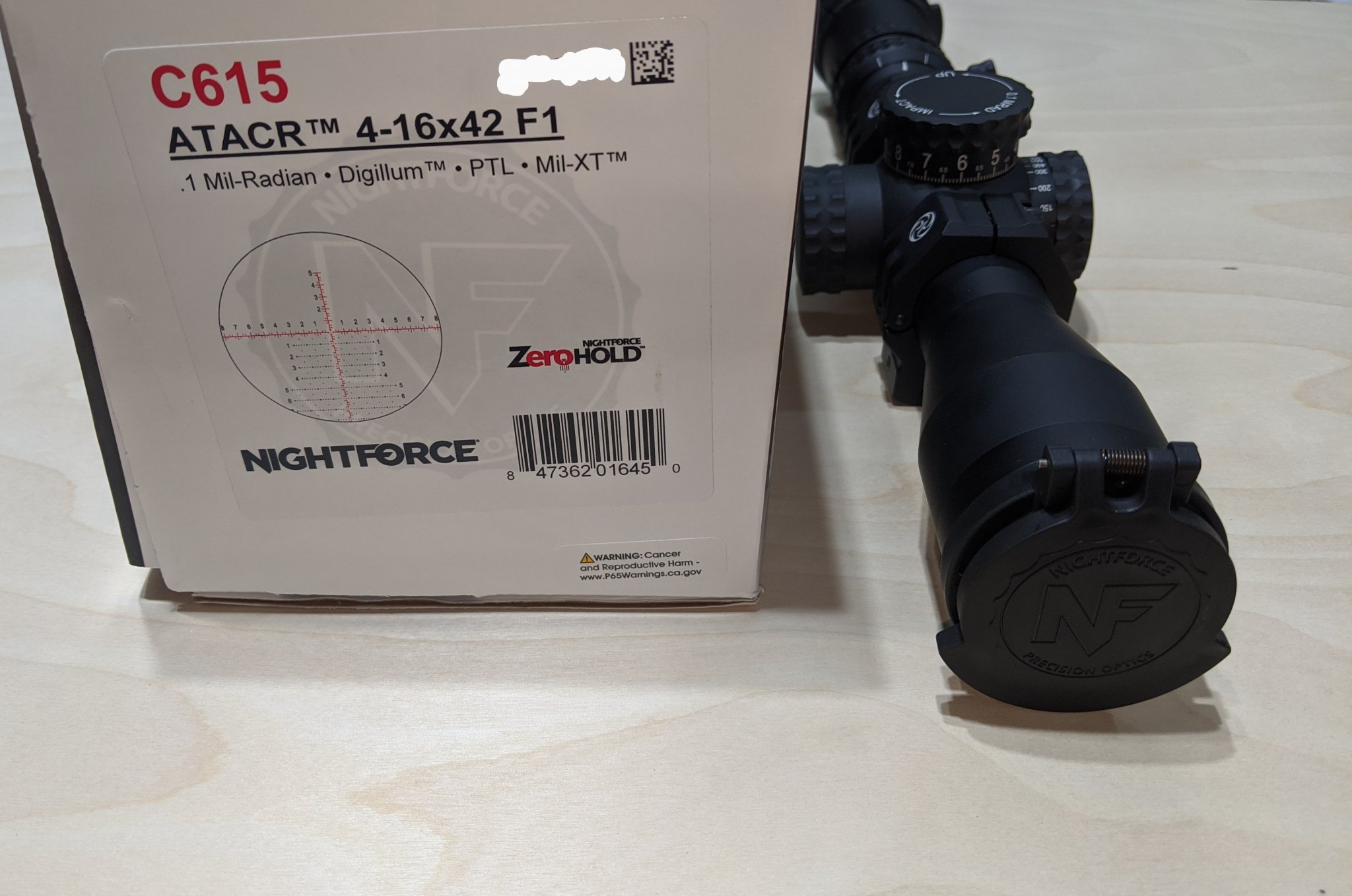 NF ATACR 4-16×42 (low profile locking turret) w/ Mil-XT reticle. This has been in two different rings/mounts but I've never fired it. It does have ring marks from the Spuhr, otherwise as new.