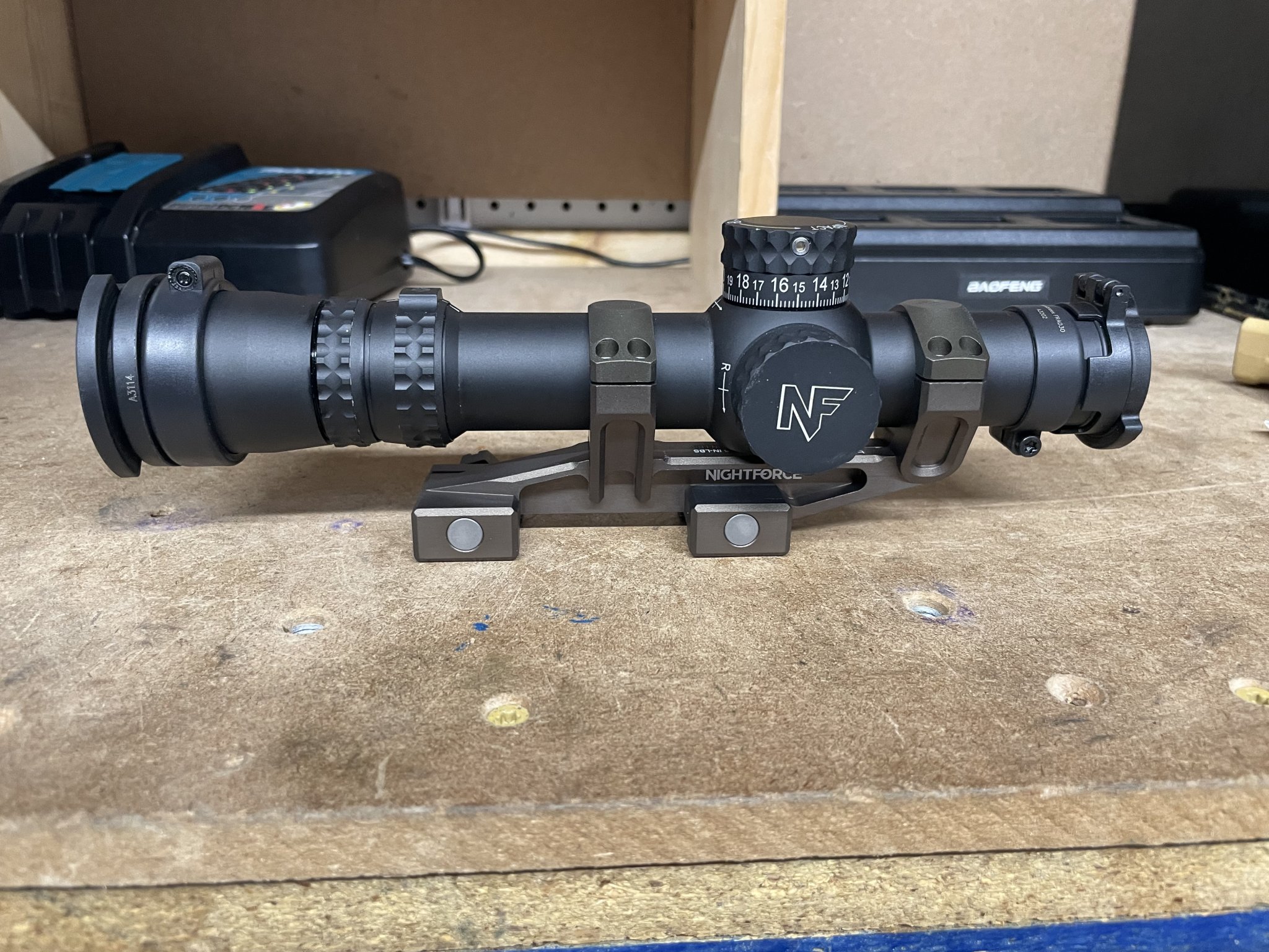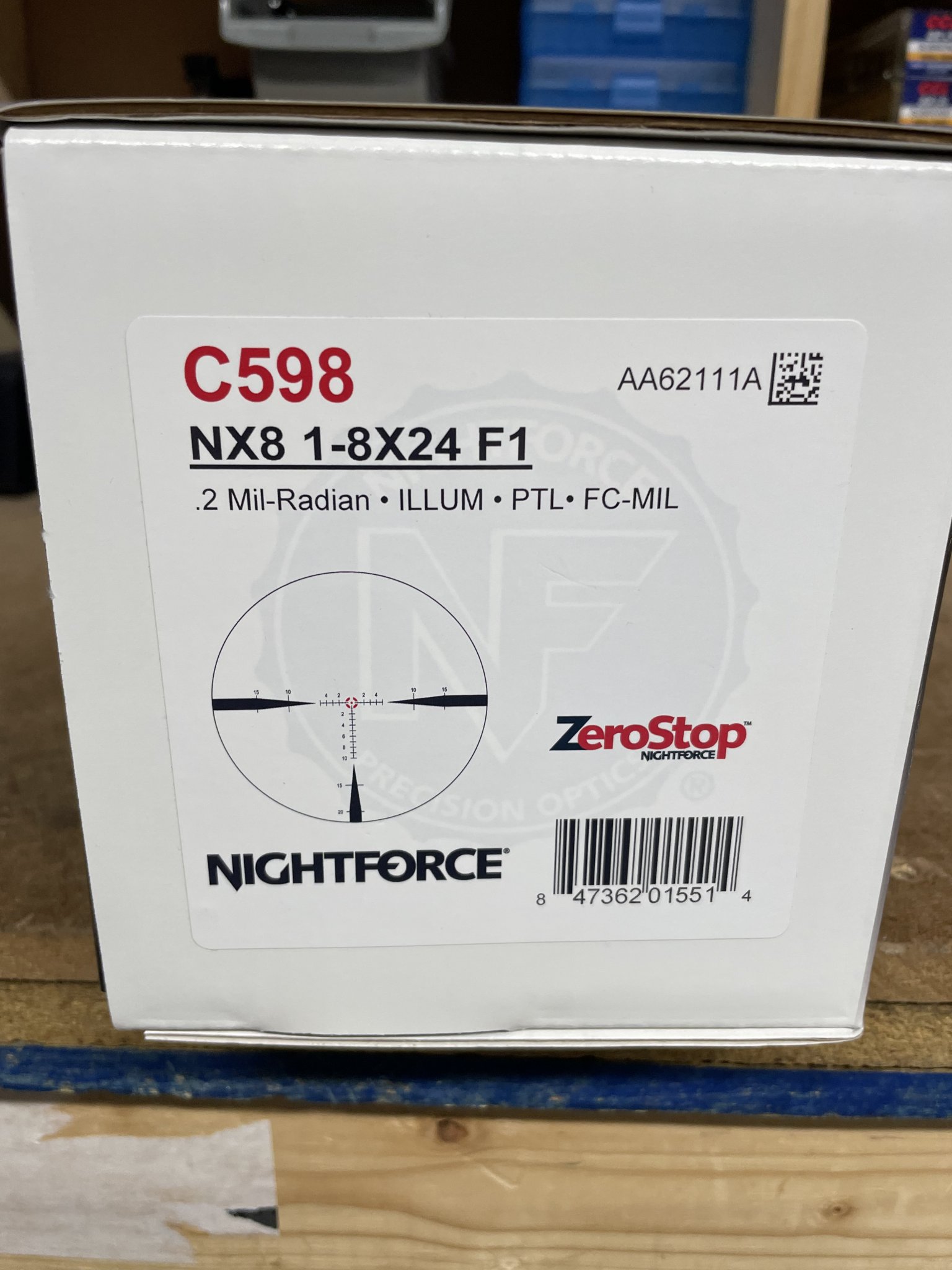 Nightforce NX8, 1-8x24 with C598 (mil) reticle. Great condition. It is in a Nightforce Ultramount, 1.54” in FDE.