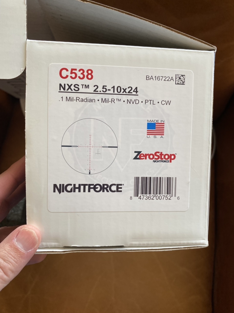 WTS excellent condition to like new Nightforce NXS 2.5-10x24 Mil (C538) NVD PTL CW in second focal plane. I bought this on here last year. It has spent the entire time mounted on a rifle. It DOES NOT include the mount. It includes the original box and paperwork.