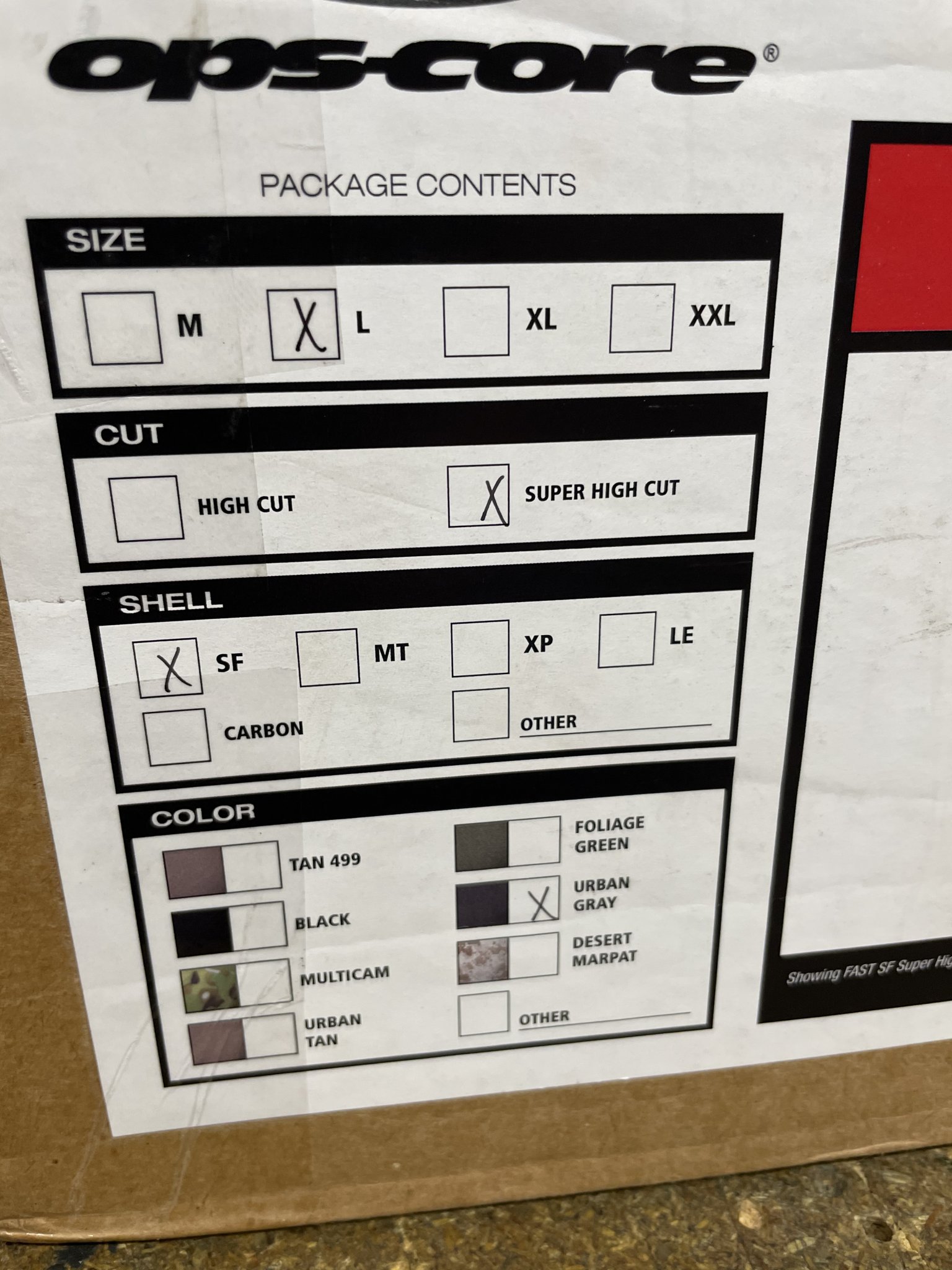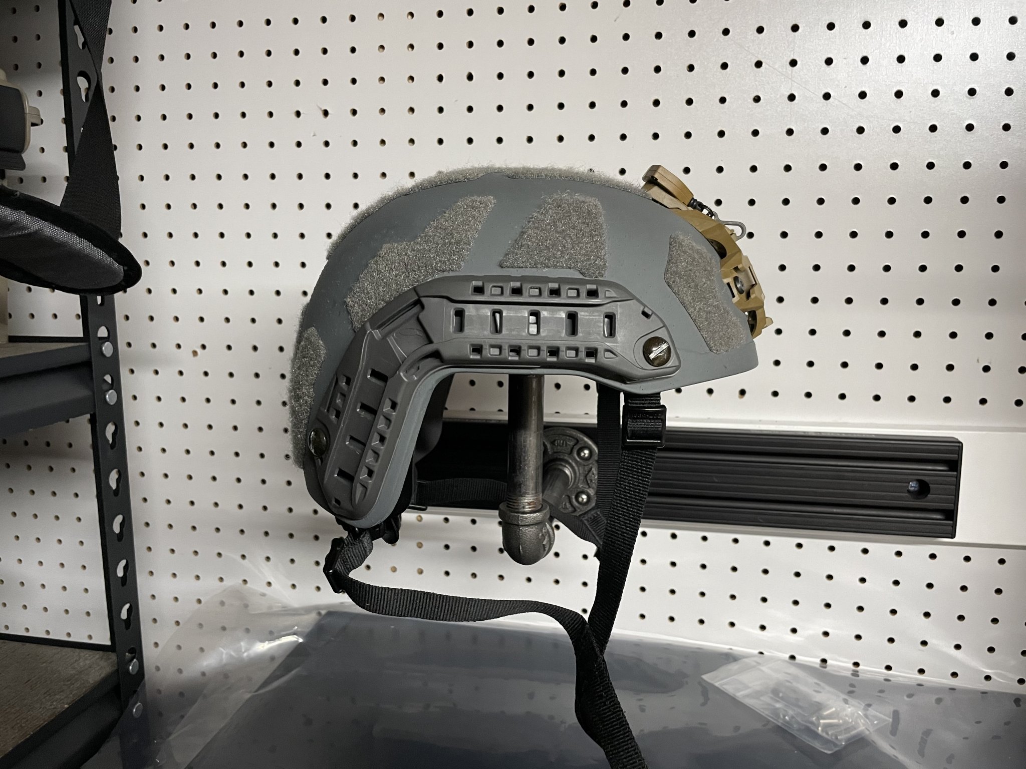 Ops Core FAST SF ballistic helmet, size large, urban gray. Like new, excellent condition. Shroud has been upgraded to a Wilcox with detachable lanyard. Original shroud and screws included (minus the bungee). Also includes original box, manual, accessory kit and the extra pads of various thicknesses.