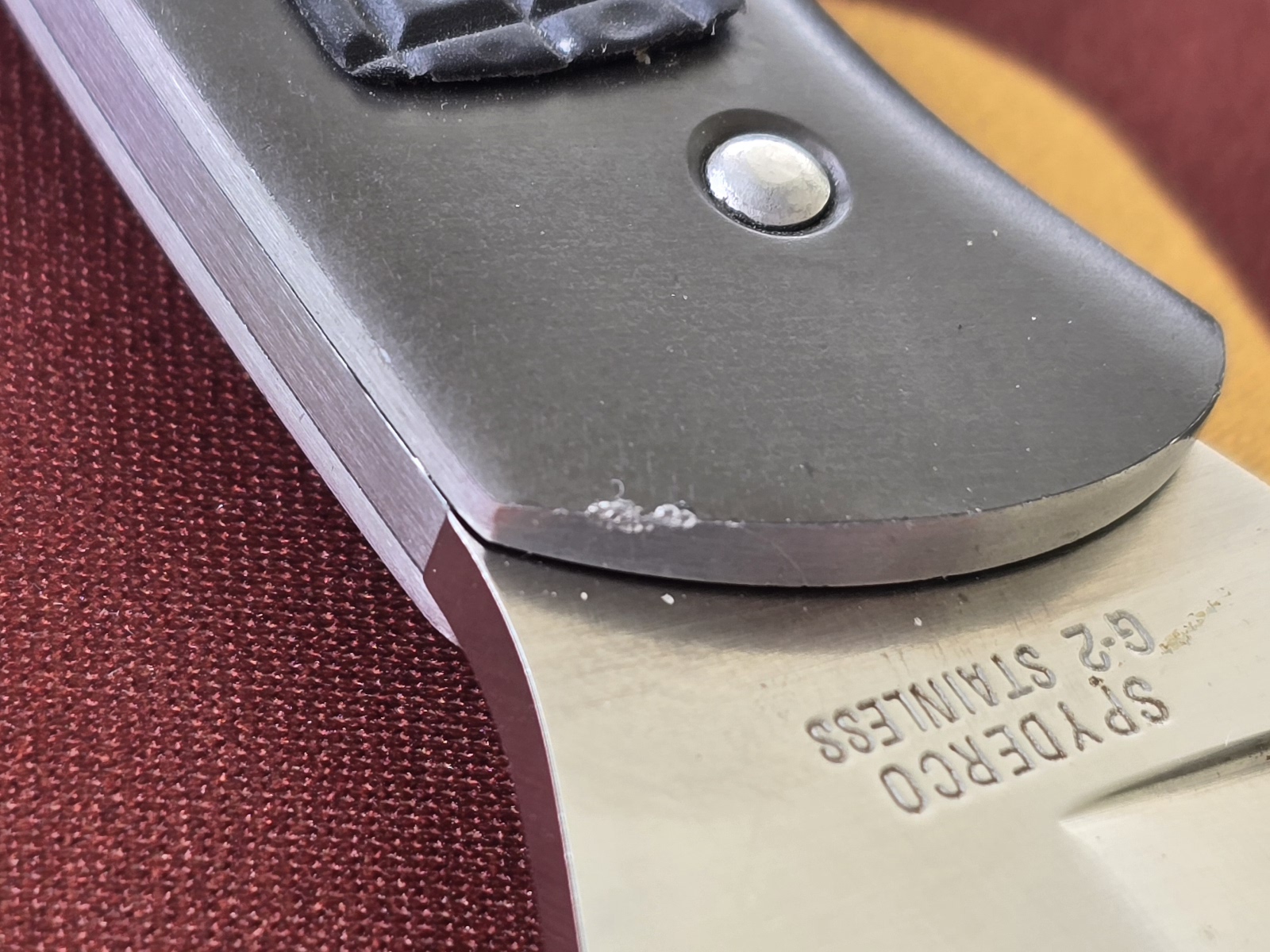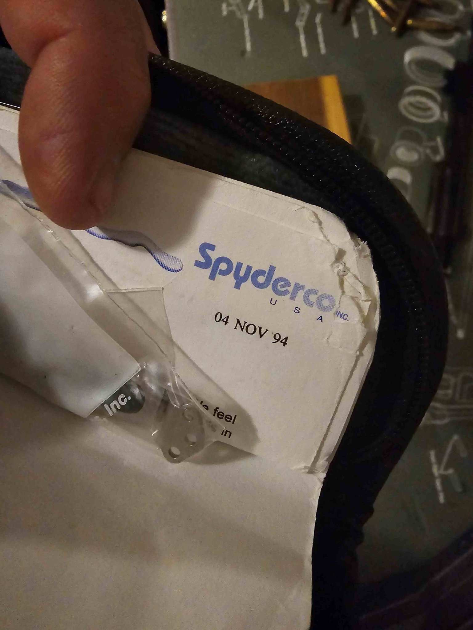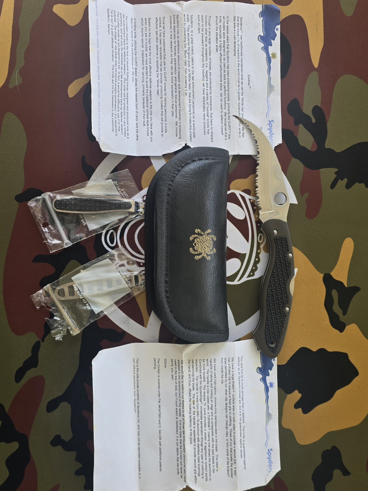 Spyderco Tuffram Civilian - Original case, letter, three clips, and of course an excellent condition knife. There are a couple very minor marks on the knife as I did carry it a couple times when I was a teenager , pictured, I'd call it 99%. That will aloow you to touch it without gloves or hopefully even carry it. I'm the original owner and I've had this knife almost 30 years. It has been in a safe about 29 of those years and I'm on a mission to clear out the stuff I don't use. I don't see one this nice on eBay and the closest comp is $575 - $560 OBO shipped on SH. Letter dated November 4, 1994 should anyone be looking for a birthday knife.
