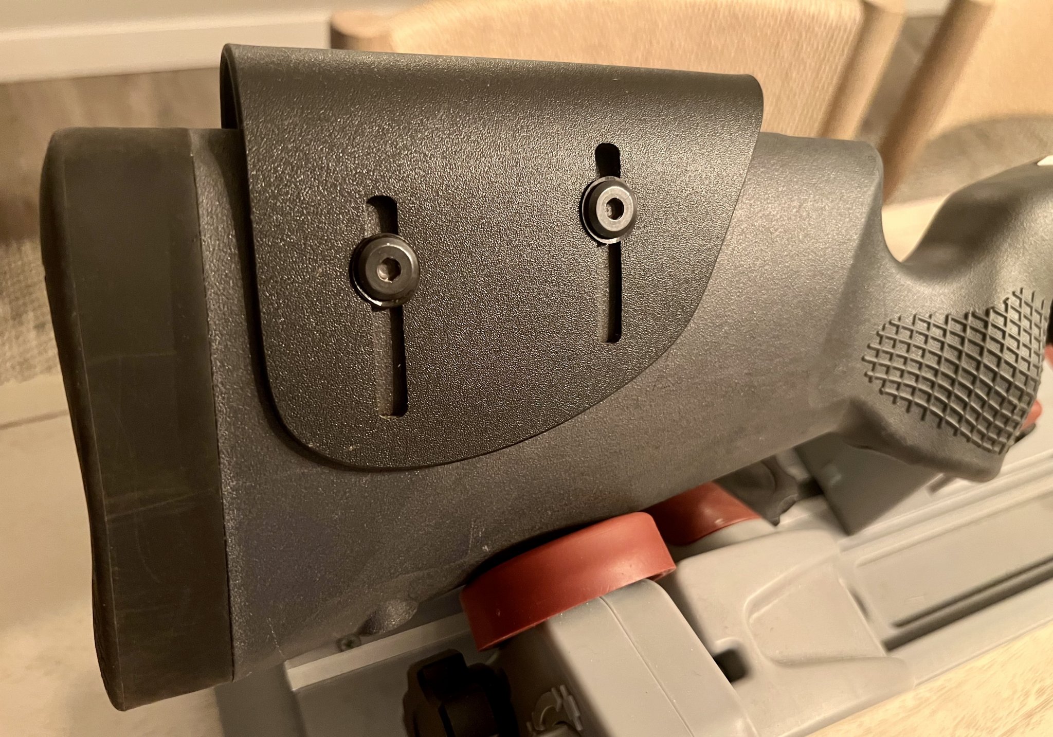 Stainless barrel, grey carbon composite stock, Seekins muzzle brake, thread protector, and adjustable kydex cheek rest (which is amazing, by the way).
