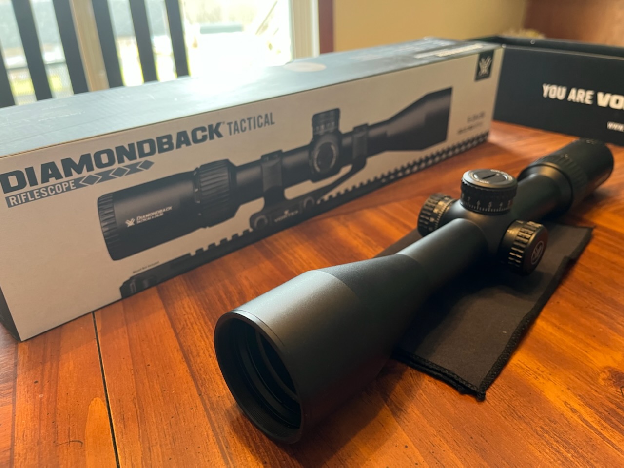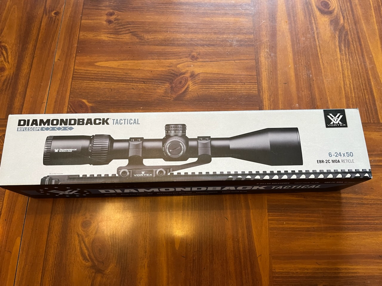 I've got a Diamondback Tactical FFP 6-24 in moa, EBR-2C reticle. Tracks great and is a great scope. Comes with sunshade and box it came in. Just has a couple tiny marks on the underside, so I have those pictured.