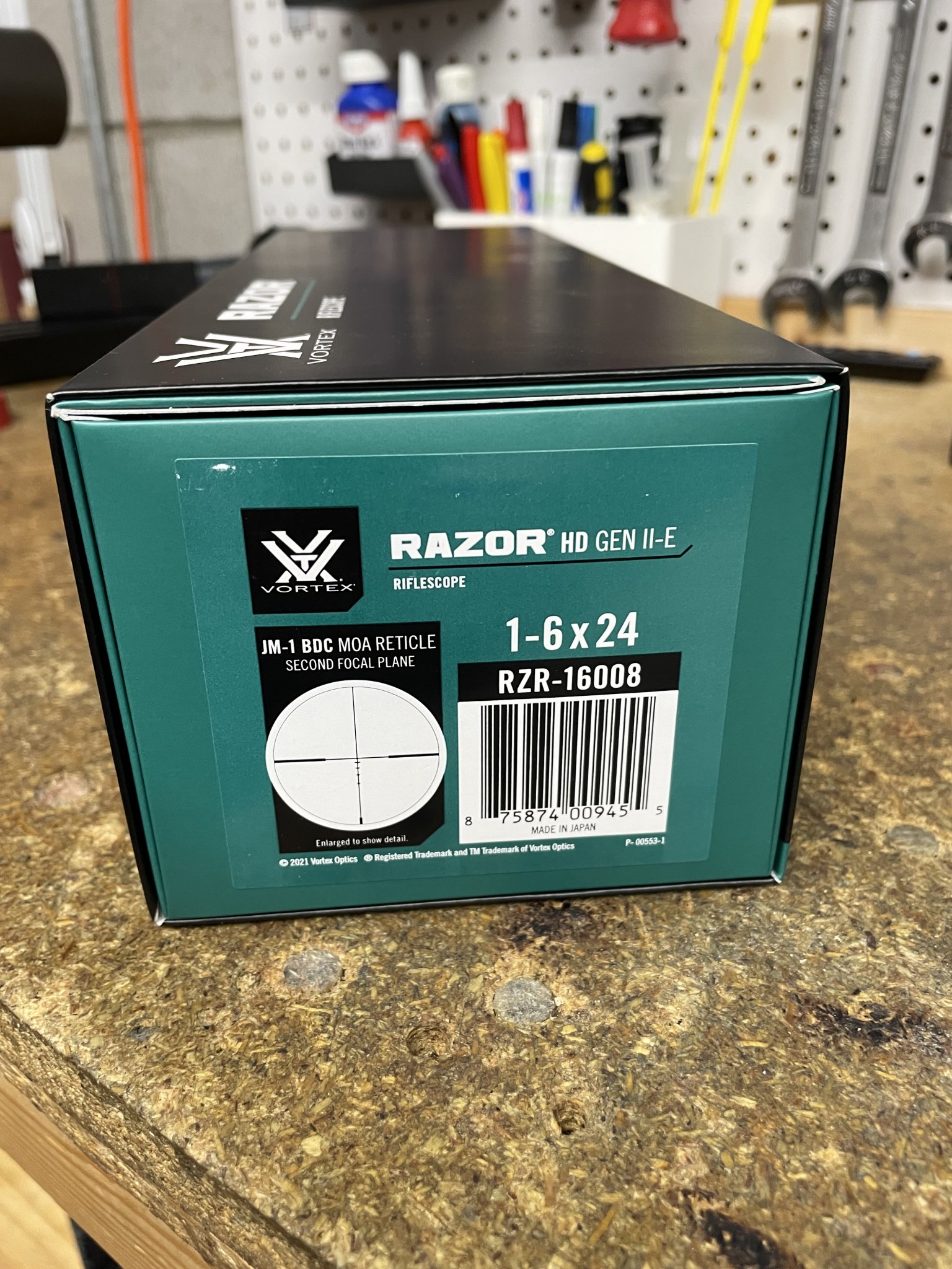 1. Vortex Razor HD Gen II-E, JM-1 BDC reticle. Excellent condition. Includes original box, manuals, etc. as well as a Vortex Switchview magnification lever.