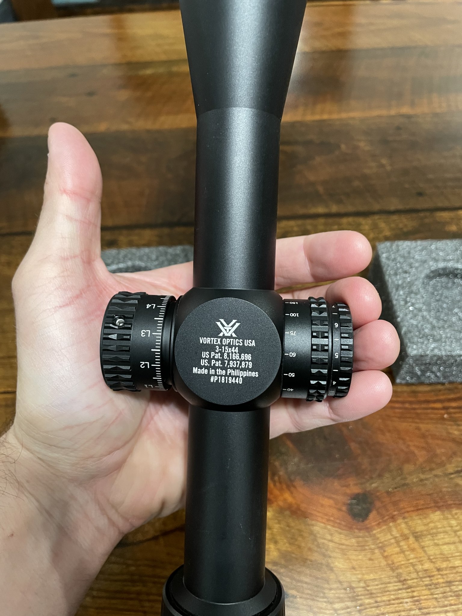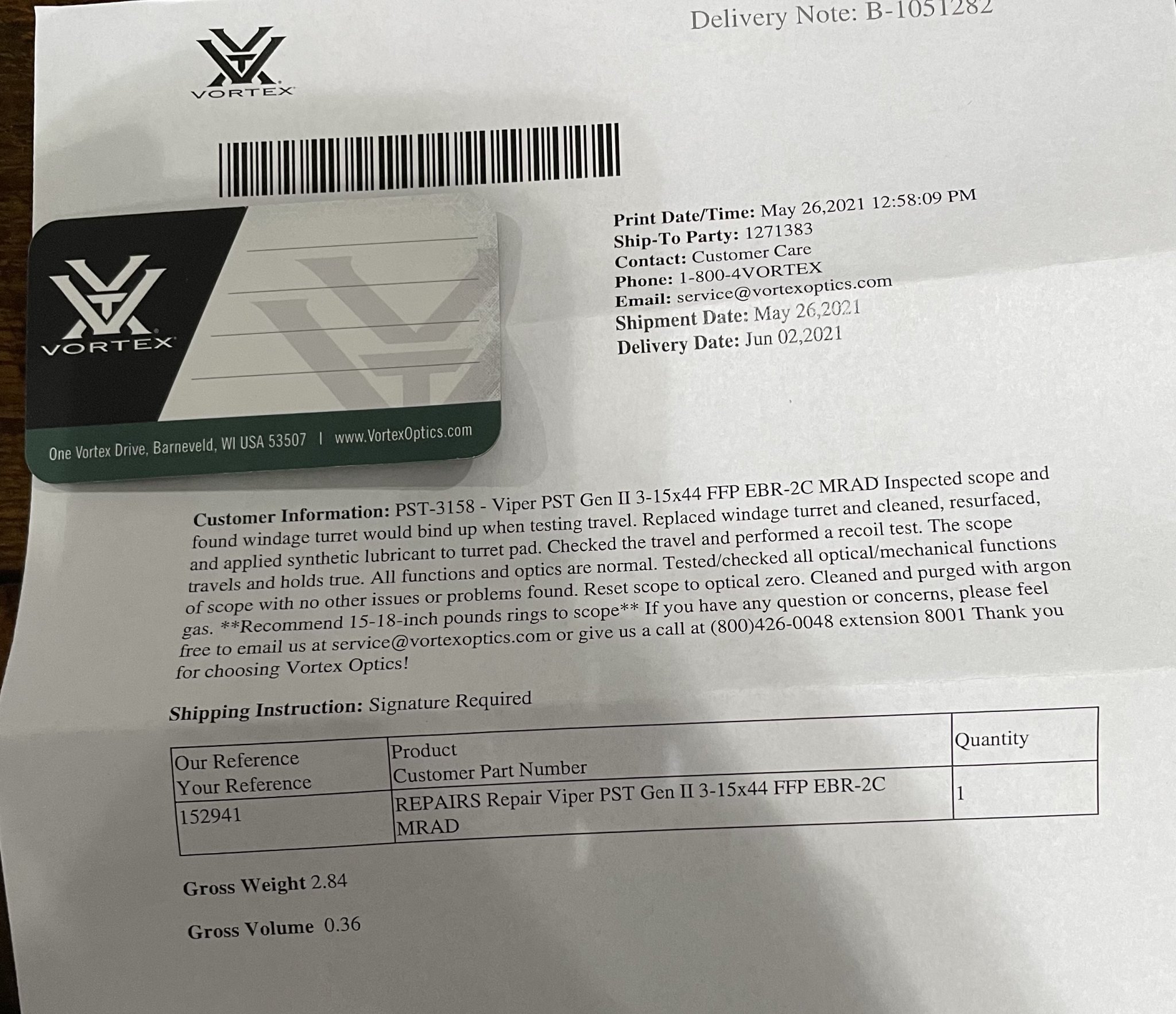 Windage turret was acting strange so I sent it it. Vortex fixed the turret and tested it along with the elevation, holding zero, cleaned scope, etc. Scope is basically in new condition besides a few safe marks, with a recent factory checkup.