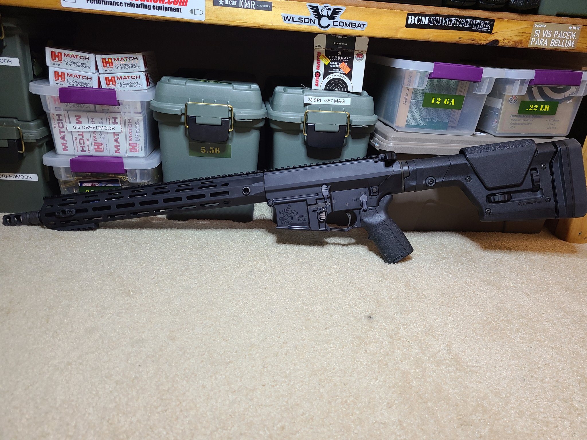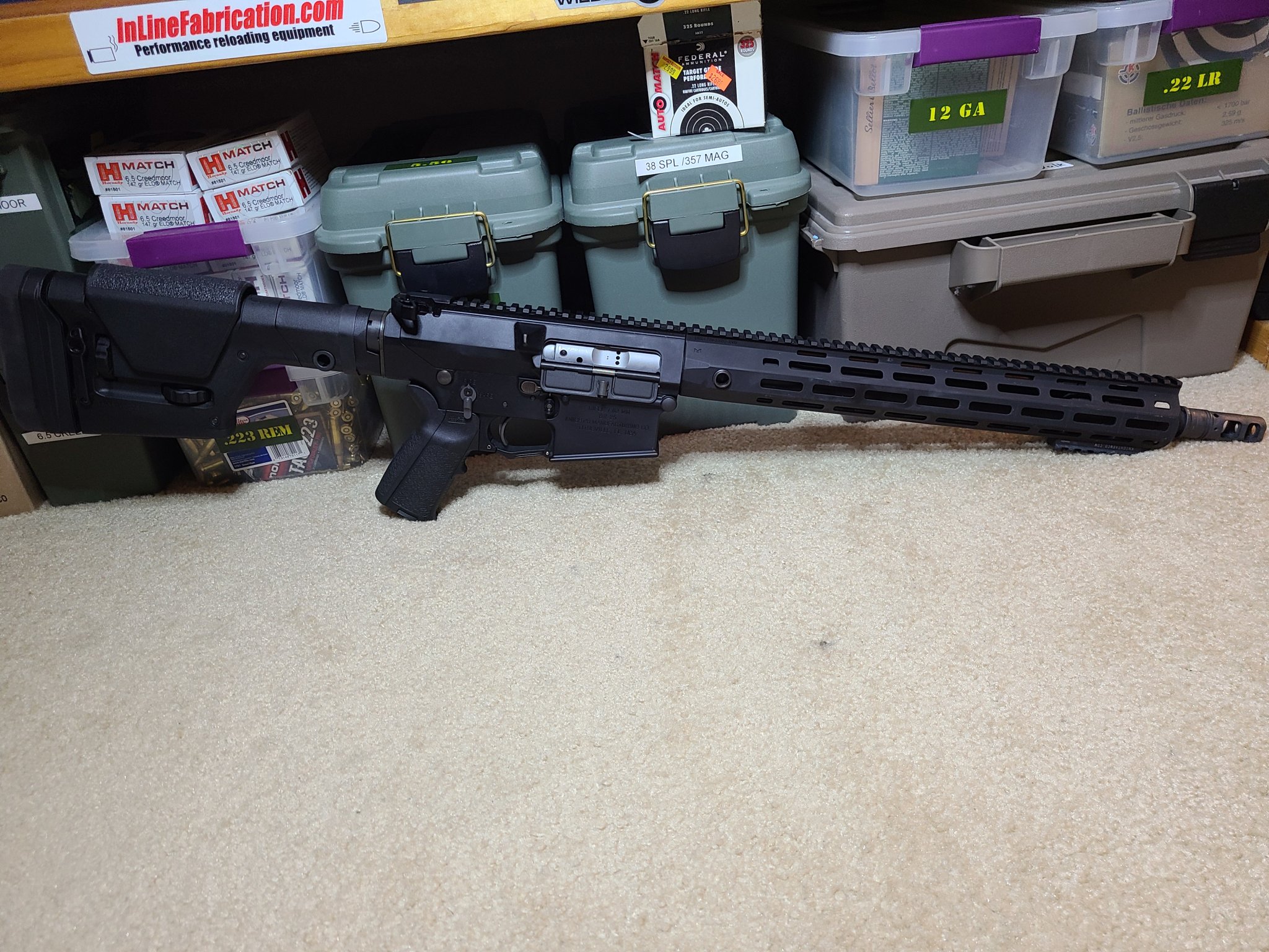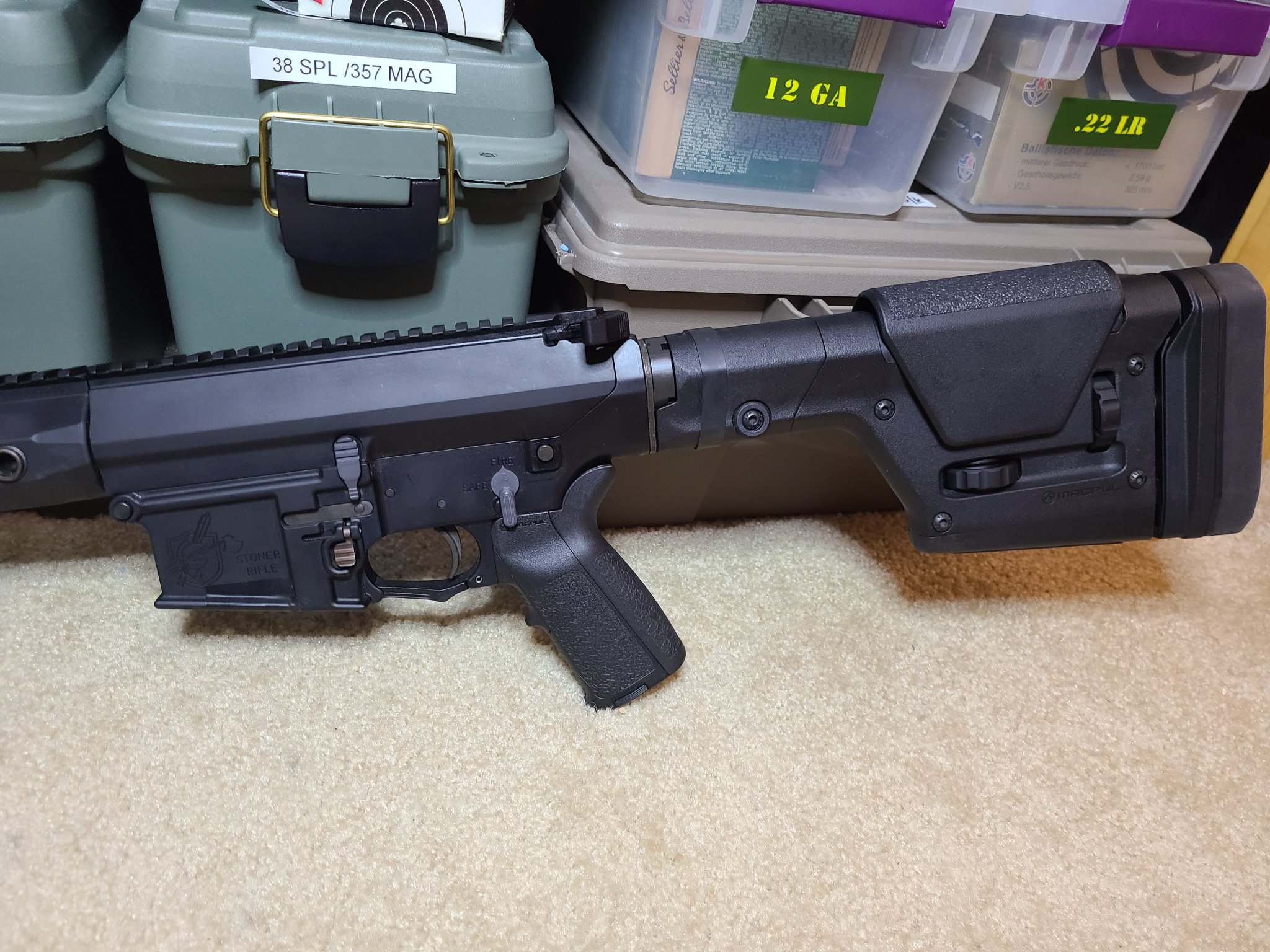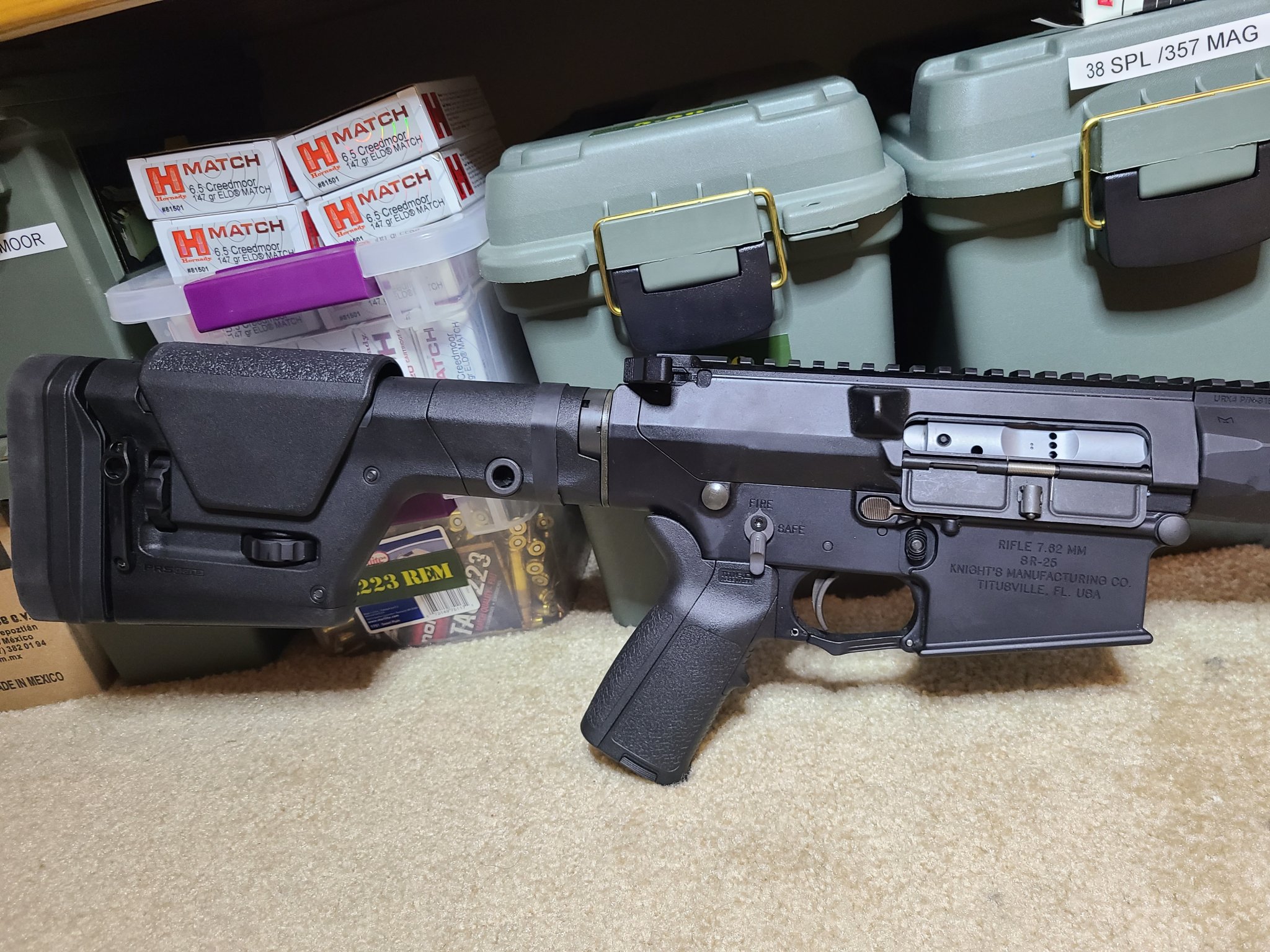 Similar to my other thread i'm looking to start saving up for a house, that means thinning out my collection a bit. Up for sale is my Knights Armament SR-25 APC (Advanced Precision Carbine) with around 750 rounds down the pipe. Its fully NJ compliant with a Magpul PRS Gen 3 stock and a pinned/welded Surefire SMFB Brake (spent some time in Texas with it hunting hogs with a borrowed suppressor so there is a bit of carbon build-up on the brake, see pictures). It also has a Magpul MIAD grip, KAC bipod rail, and a Radians Weapons Raptor charging handle (will include the original KAC charging handle too). Rifle will come with 5 10 round PMAGS (because NJ), KAC case and manual/documentation.