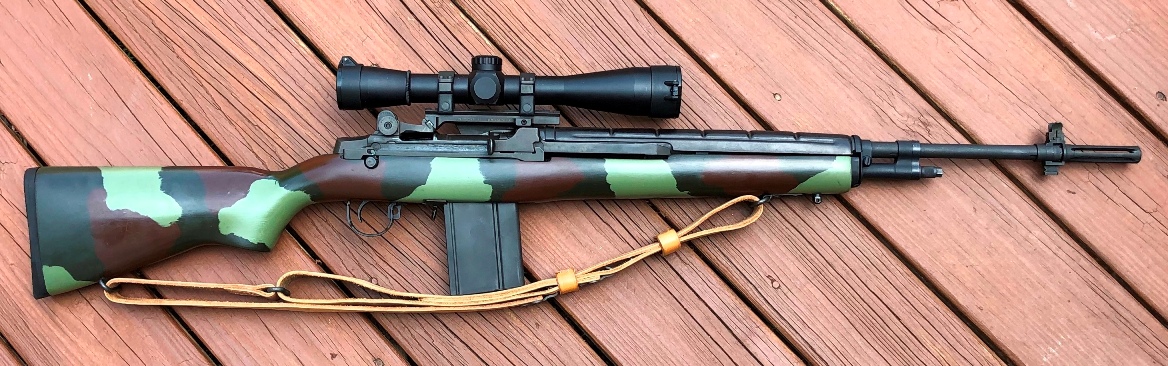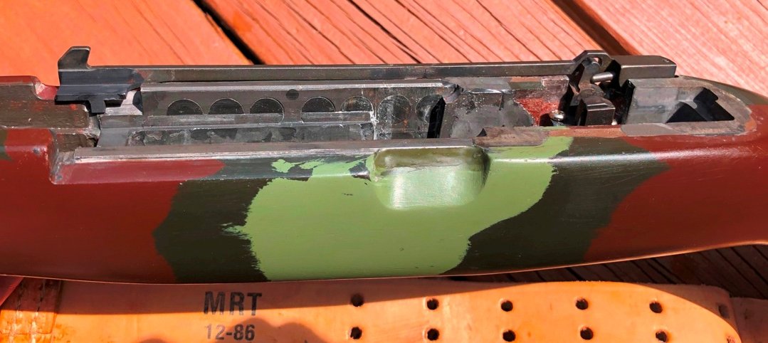 • McMillan M1A stock molded in forest camo (likely early 1990s era) w/ multiple modifications, including: