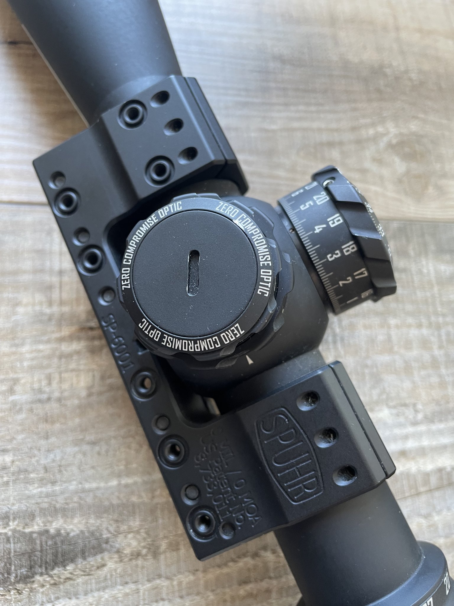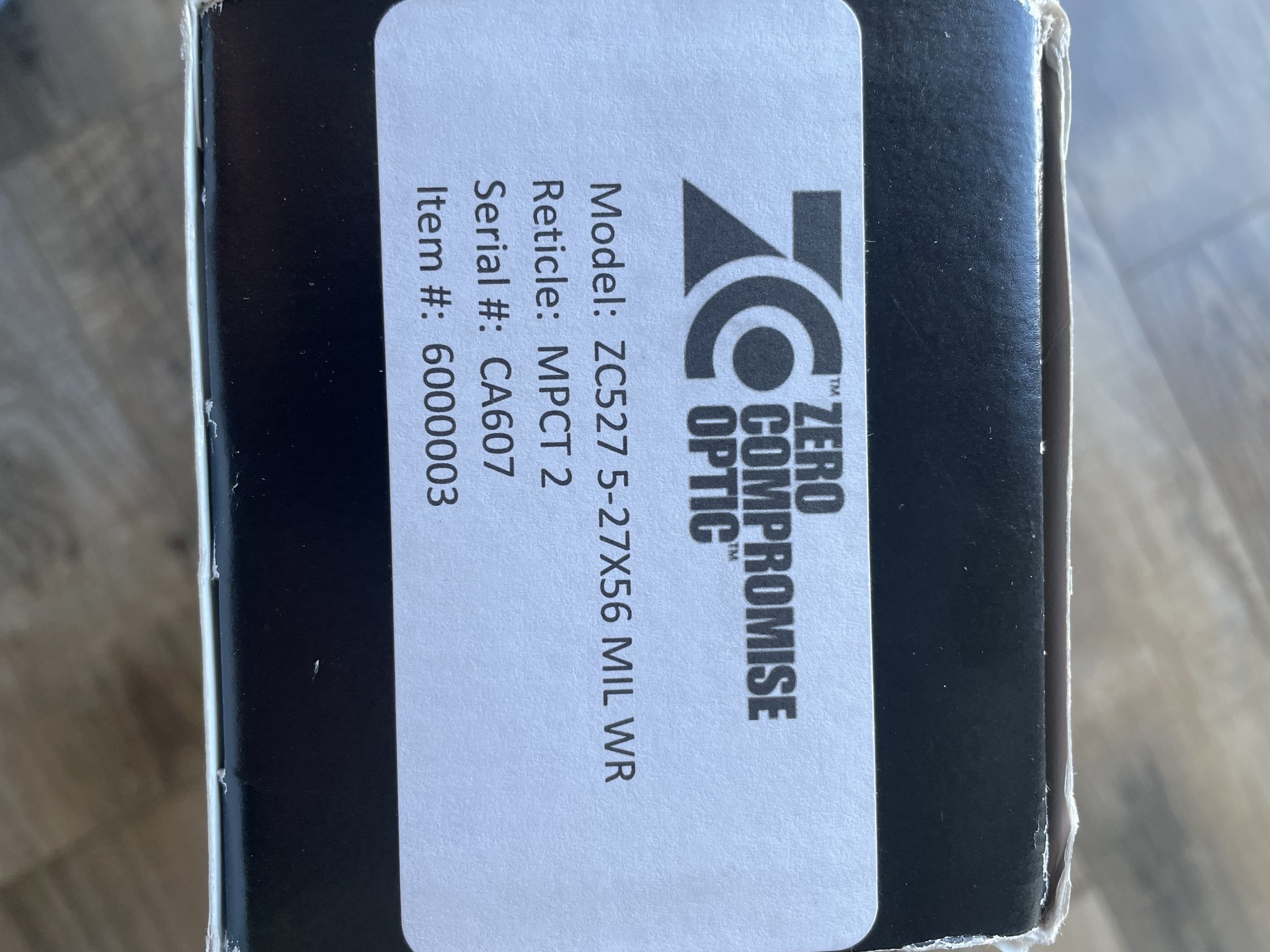 For Sale: Zero Compromise Optic (ZCO) 5-27x56 with MPCT2 mil reticle. This optic is gently used (2 matches) and in great overall condition. Some small finish flaws on elev/wind/parallax turret edges as expected from light use (shown in pictures). Has amazing glass, clarity and tracking. Optic is currently mounted in a Spuhr 6001 mount (36mm, 0 cant, 1.18 height), could separate. Spuhr mount is available and in great used condition as well. ZCO 5-27 shipped in original ZCO box for $SOLD