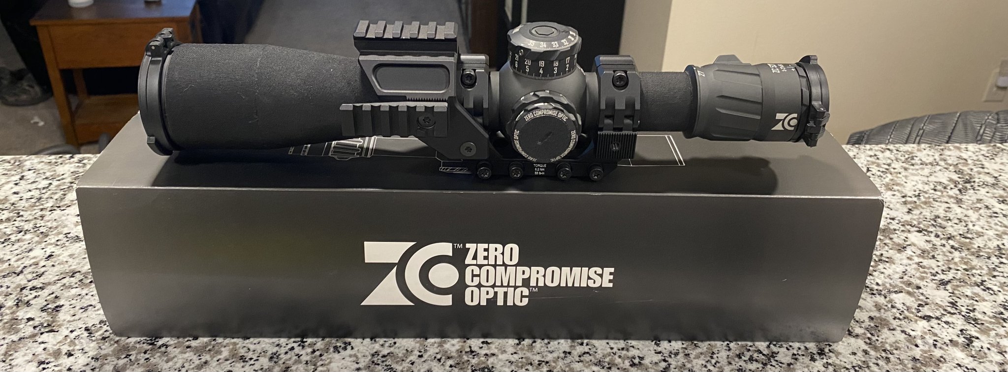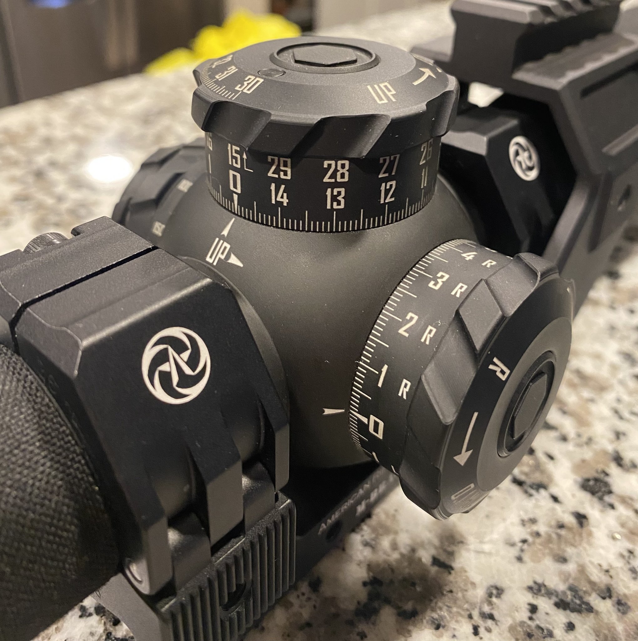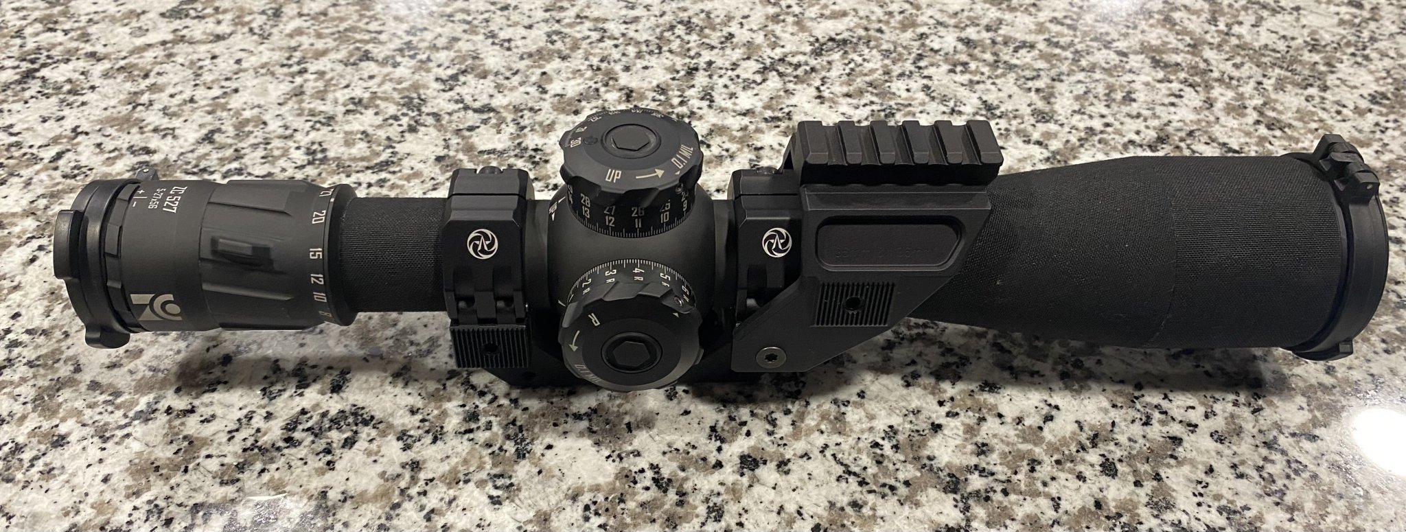 Scope is in like new condition and comes in original packaging including all accessories. No scratches/marks on scope housing, turrets, or glass. Scope has had black ranger wrap on it since it was mounted to completely protect scope body. Comes with 20 MOA, 1.5” M-brace mount w/ LRF bridge and one picatinny accessory rail (also includes bubble level, not shown). Mount is in like new condition, very minor wear marks on rails and clamp from normal use. Also includes set of Tenebraex caps. Turrets, mag ring, parallax, illumination all in perfect working order.